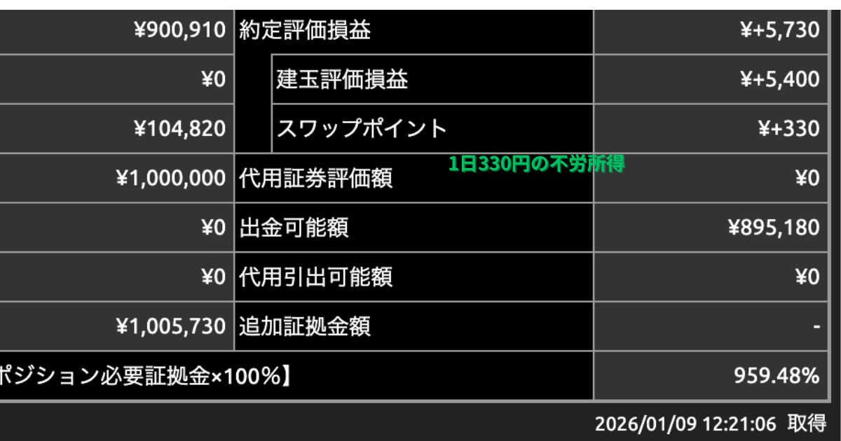 レバレッジは約2.5倍と、極めて安全な水準をキープしています。 この「負けない運用」を続けながら、目標である「月3万円(1日1,000円)」のスワップ収入に向けて、タイミングを見てポジションを増やしていく予定です。