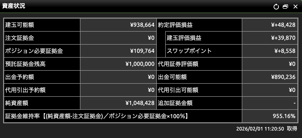 多くの短期トレーダーがパニックに陥る中、私が冷静でいられた理由は2つあります。 1つは、積み上がったスワップポイントがクッションとなり、実質的な取得単価を下げてくれていること。もう1つは、維持率950%台という、徹底した低レバレッジ運用を貫いていることです。 「相場の嵐」が来ても、根を深く張っているカメの歩みは止まりません。